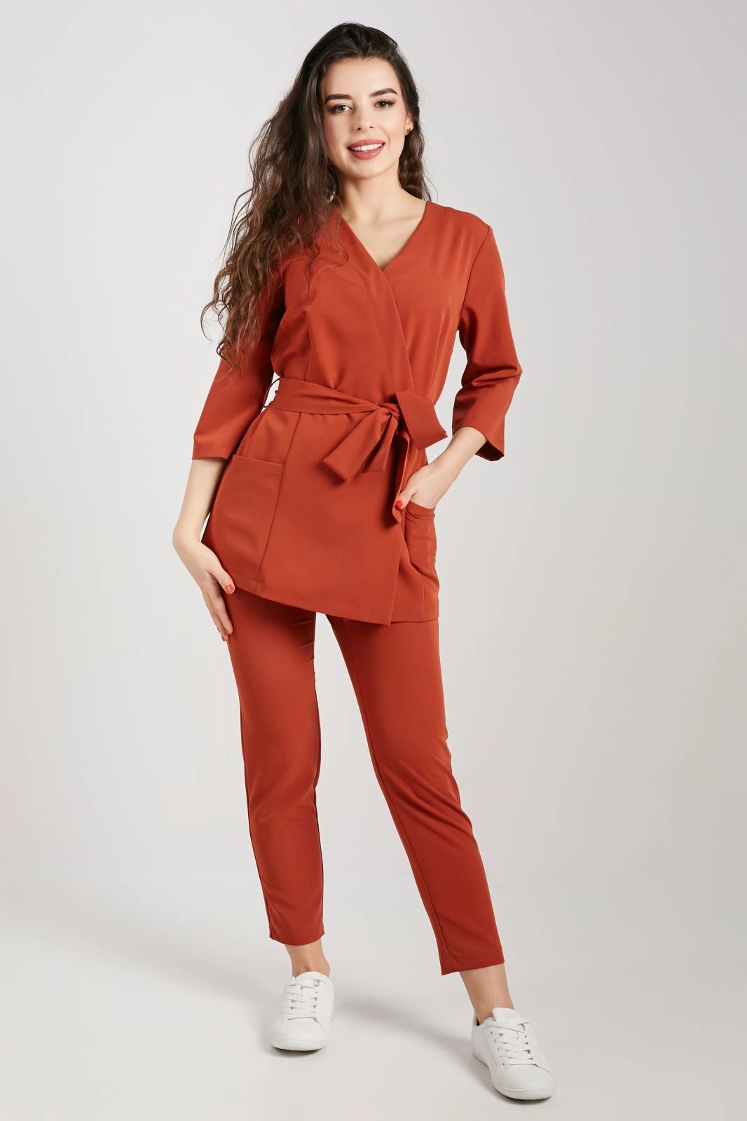- Szeroki pasek w talii umożliwia dopasowanie tuniki medycznej do każdej sylwetki dodatkowo ją podkreślając